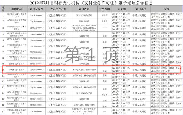 根据中国人民银行公布的“2019年7月非银行支付机构《支付业务许可证》准予续展公示信息”,乐刷等多家非银行支付机构成功完成续展,支付牌照有效期为2019年7月10 日至2024年7月9日。