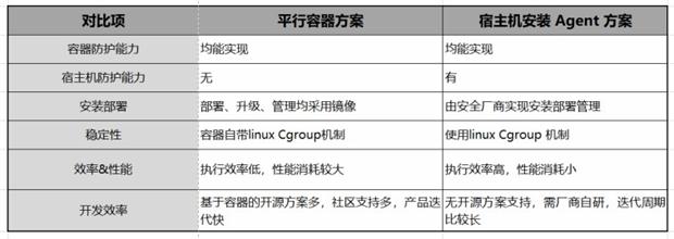 基于宿主机Agent的技术方案:即基于Agent的主机防护能力,监控宿主机上容器相关的文件、进程、系统调用等等信息,增加其Agent中对于容器的清点、监控、防护能力,通过一个Agent,实现宿主机安全、容器安全两种防护的效果。国内新一代主机安全厂商青藤云安全是此类方案的践行者。