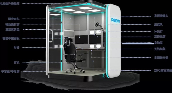 (1)一体化箱体结构:整个直播舱是封闭型的箱体结构,长2.2米、宽1.7米、高2.4米,占地仅3.74平方米,一个普通会议室就可以同时安装多个直播舱,满足高密度部署、多人同时直播,单舱即可容纳两人进入。舱体由顶级钢材搭建,防水、防锈,自带负重轮,可灵活安装、便捷移动。舱体外观也支持品牌专属定制,设计为品牌LOGO或VI。