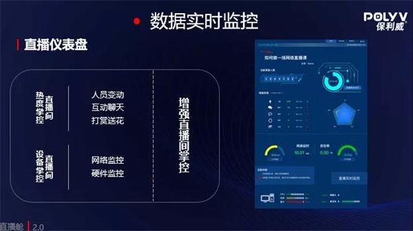 二则是直播舱内特设的数据看板大屏。通过保利威专属直播软件,从底层抓取直播数据,并在仪表盘中将数据实时可视化呈现,讲师可以实时掌握直播间动态。这个看板的数据支持主要服务于直播中的讲师内容调整和流程优化。