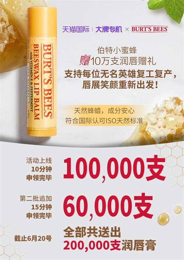几个月前开始全社会复工复产,但炎热的天气下人们“口罩唇“的问题越发严重。基于这个细心的洞察,在6月中旬,美国经典天然品牌Burt’s Bees伯特小蜜蜂,联合天猫国际“大牌专机“,推出了年中致谢活动,以10万支润唇赠礼支持无名英雄复工复产。仅仅十分钟,10万支润唇膏就被一抢而空,伯特小蜜蜂紧急调货,最后在一周时间内共送出了20万支润唇赠礼,获得超过了17万的消费者参与和点赞。