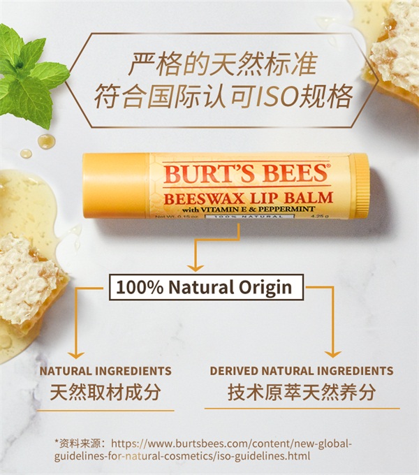 Burt’s Bees伯特小蜜蜂自1984年创立以来,一直坚持“萃取天然,尊重天然”的理念,从原料取材、天然配方调配到生产过程和包装材质,都是贯彻环保绿色的高标准,在国际上一直是天然护肤理念的先行者。比起市面上越来越多品牌打着“天然”概念却以浑水摸鱼的标准生产产品,自2019年,Burt’s Bees作为全球首个天然护肤品牌主动采纳了现在唯一国际认可的ISO16128天然化妆品标准,产品的原材料配方和生产工艺均以符合甚至高于ISO标准定义的天然规格来进行。