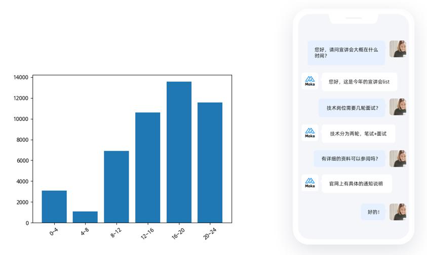 在连锁企业招聘量大的场景下,智能问答机器人可大大减少HR的工作量。Moka在调研中发现,大约26%的候选人会在晚8点到凌晨12点咨询招聘事宜,正值HR下班时间,此时Moka智能问答机器人则可以接待候选人,获取候选人简历,避免人才流失。