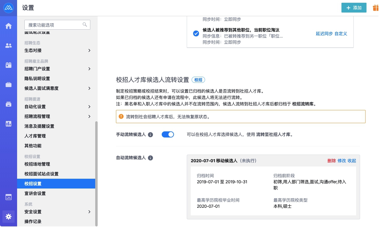不少连锁企业的校招人才离职率很高,校招候选人进入职场后,随即成为社招候选人,为进一步挖掘企业自有人才库的资源复用率,Moka可设定校招人才库下符合条件的候选人资源自动流转至社招人才库,为人才供给提供更充足的资源,更便捷的人才触达。