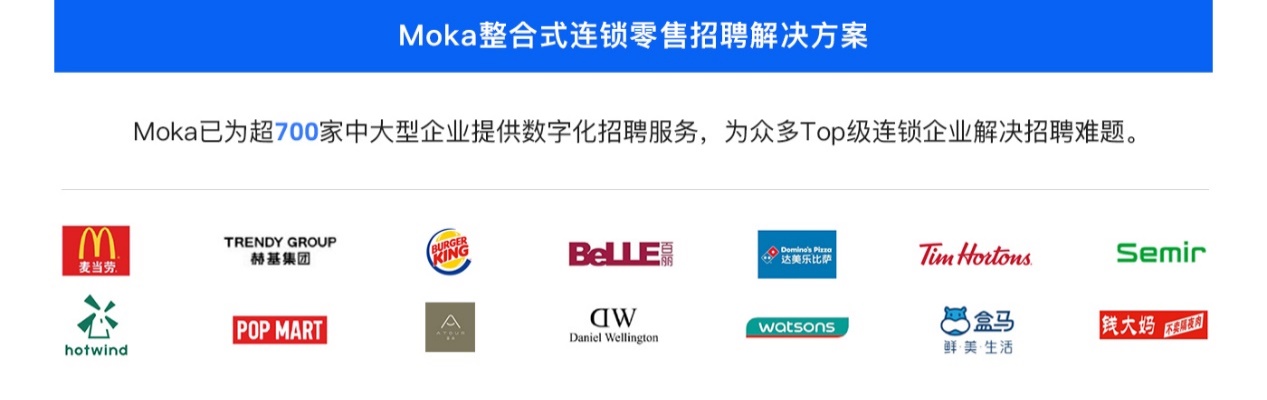 连锁企业校招岗位丰富,所面临的场景更加丰富,更多短平快的操作请查阅Moka整合式连锁零售招聘解决方案和Moka校招解决方案。