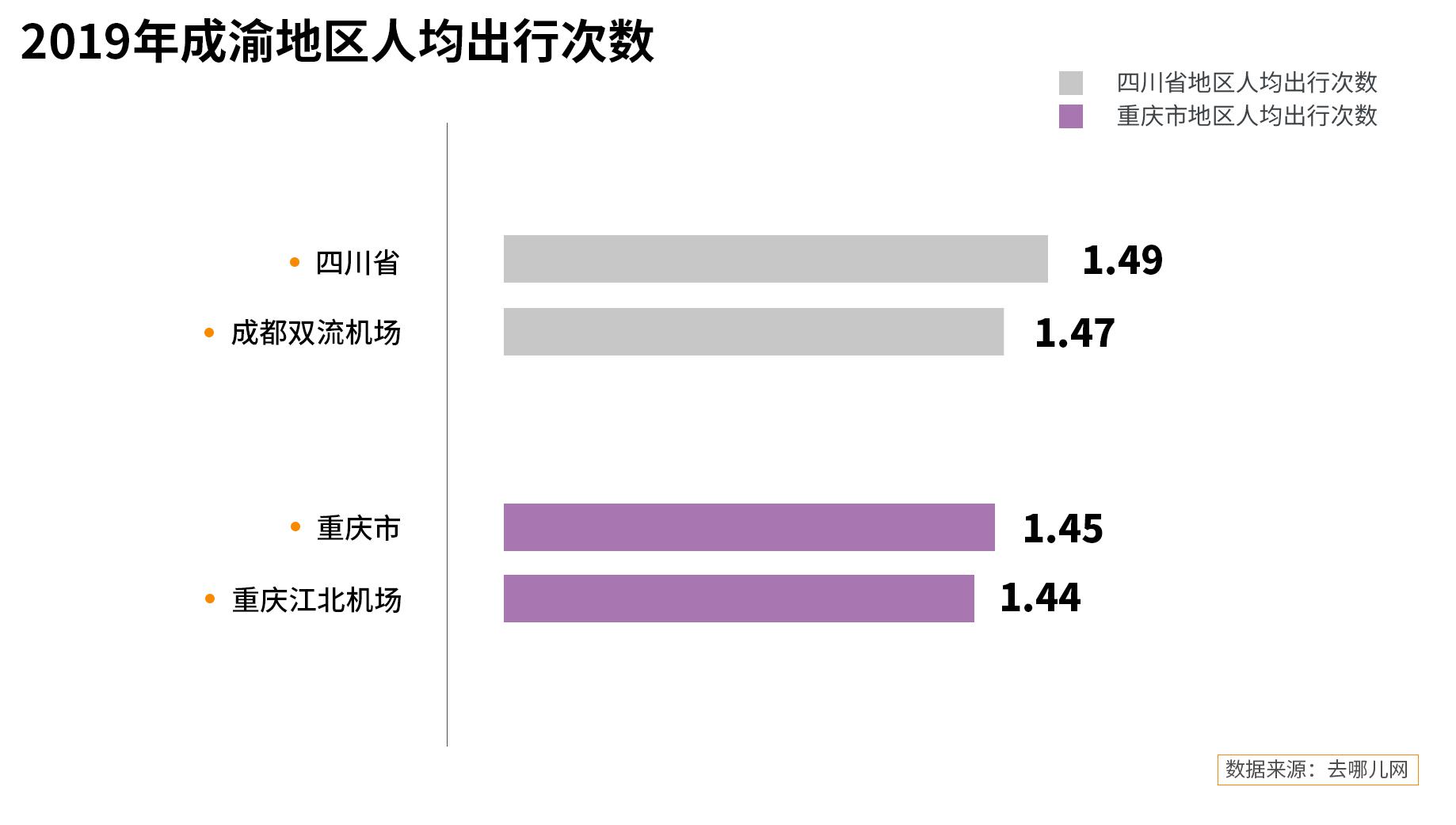 据去哪儿网数据显示,2019年四川地区机票预定量较前一年增长10%,人均出行1.49次,重庆全市机票预定量较前一年增长9%,人均出行1.45次。川渝地区成为机票预定量增速最快的地区。