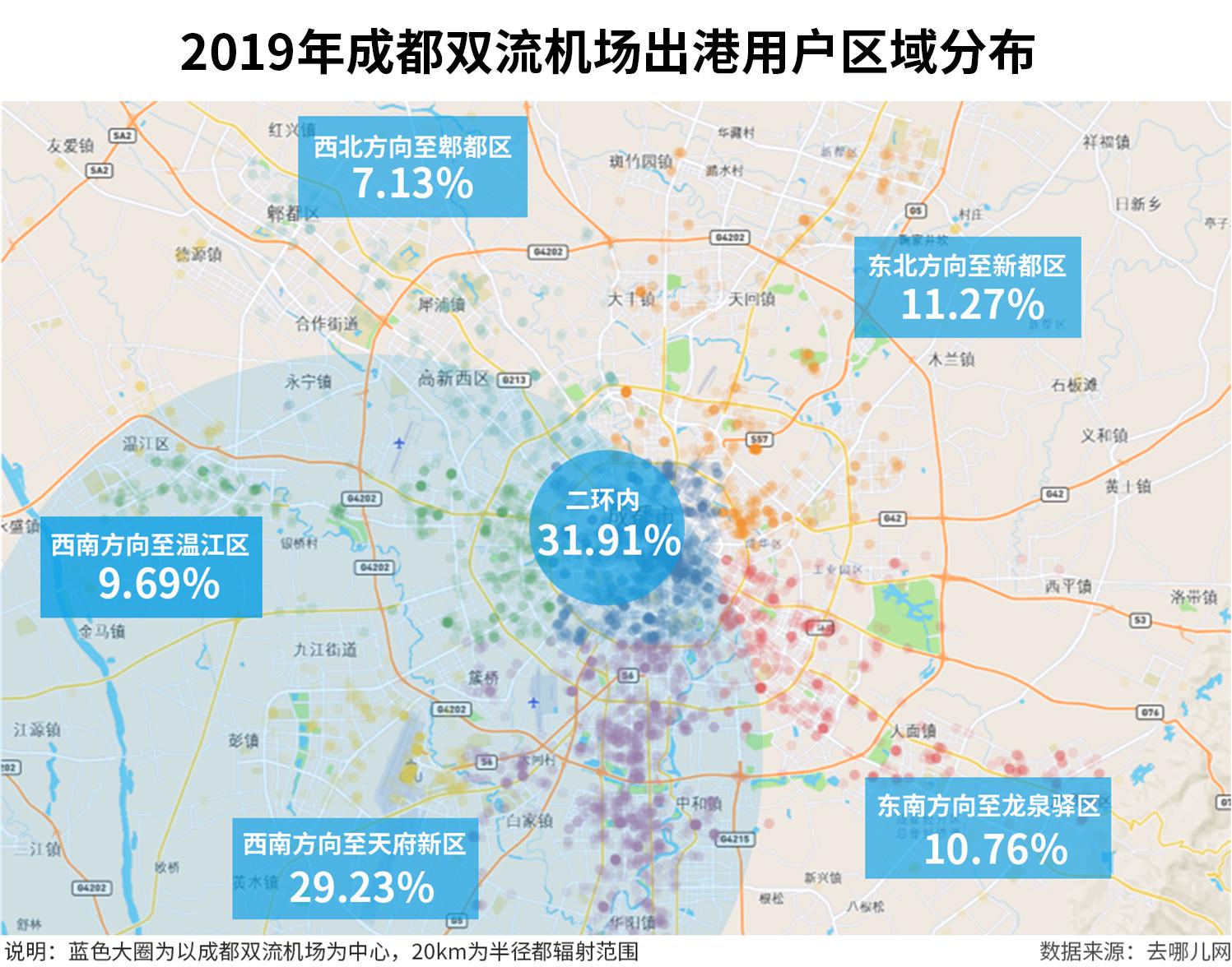 此外,据去哪儿网大数据中心数据显示,成都双流机场最主要的客源二环内城区、天府新城区域,两个地区的旅客占比超过6成。其中,二环内城区旅客的占比最大,达到31.91%,天府新区占比达到29.23%。双流机场20公里以外辐射圈的新都区、龙泉驿区、郫都区生活居住的人群,将更有可能成为天府机场的客源。