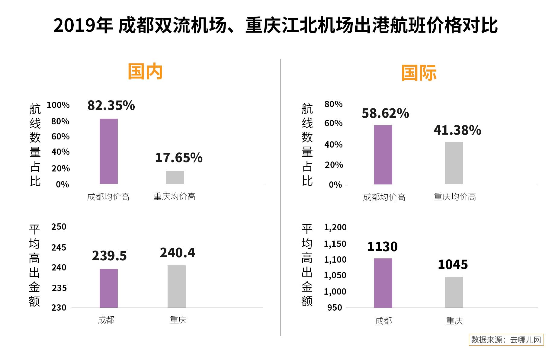 据去哪儿网大数据中心研究分析,价格或许成为影响成渝地区机场增长的一大原因。在双流机场与江北机场的横向对比中,2019年成都双流机场平均成交价格达到1622元,而重庆机场均价为1287元,在成都和重庆都有的航线中,重庆出港的8成国内航线都更有价格优势,优势部分均价差达到239.5元。而在国际航线中,重庆出港依然保持58.62%航线的价格优势,其均价差达到1103元。