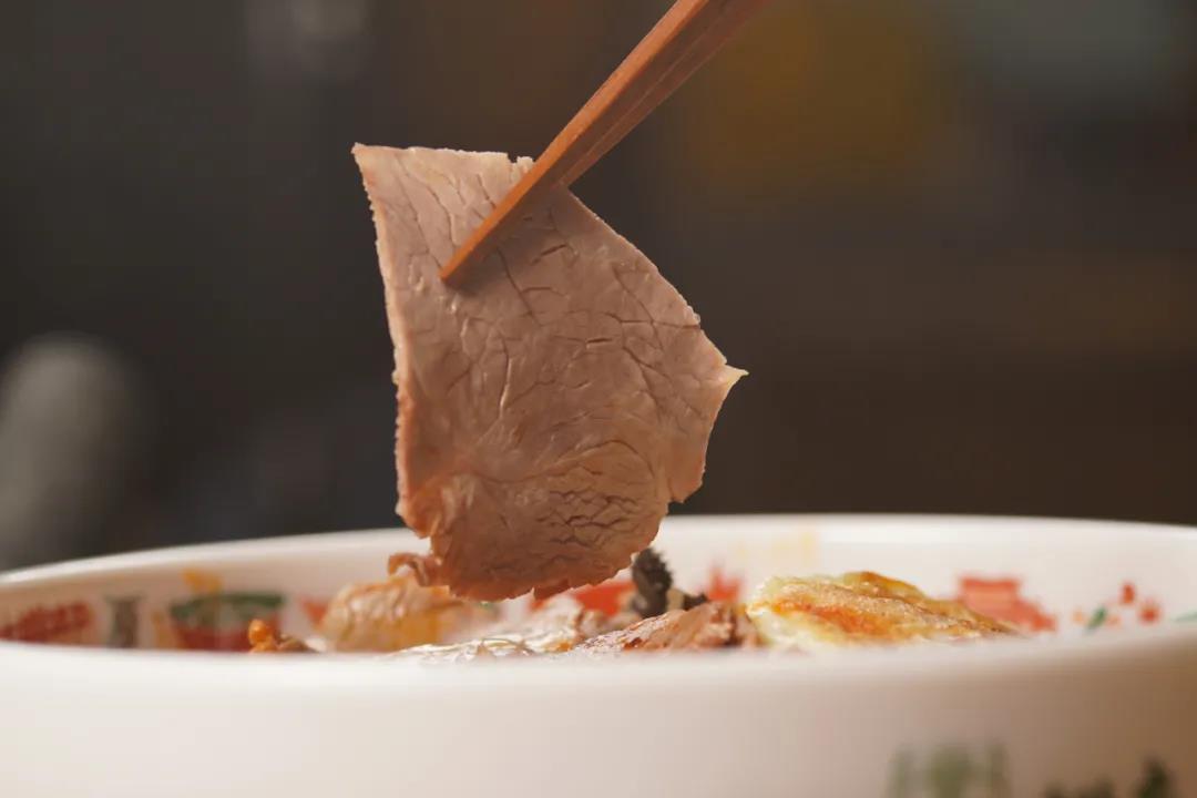 羊肉顺着肌理斜切成片,厚薄适中方便咀嚼,肌肉纤维细腻,丝丝分明,肉质香甜回甘。