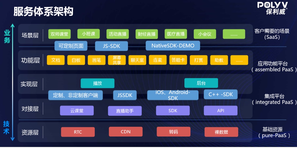 对于生态圈的发展趋势,我觉得,未来一两年,技术层面上,底层的需求会越来越旺盛,生态链最底层的云厂商发展趋势良好;保利威这样处于中间层的产品,由于具备定制化、可集成化能力,适配多样化市场需求,业务会比较稳定,可持续发展能力高;但是,再向上一层,像ClassIn或SaaS这种具体形态的应用则会像某种口味的面一样,可能会随着政策和行业波动会有生有死。